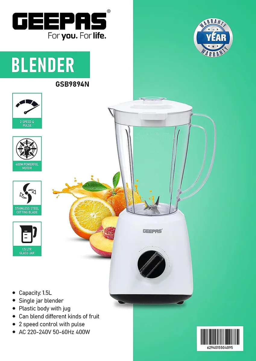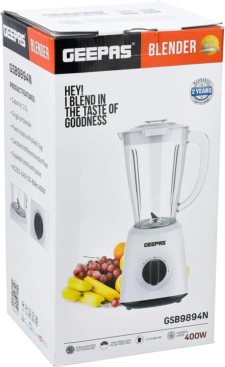 - Geepas Blender, 2 Speed & Pulse, 400W Powerful Motor, Gsb9894N Stainless Steel Cutting Blade, 1.5 Litre Glass Jar, 2 Years Warranty, White, Gsb9894
