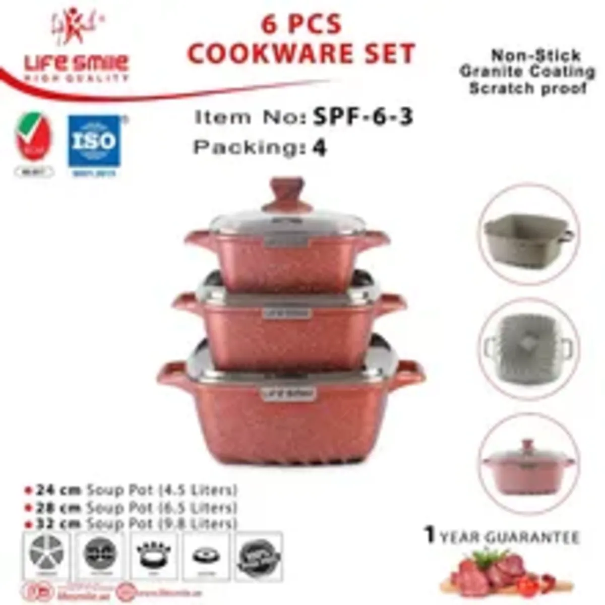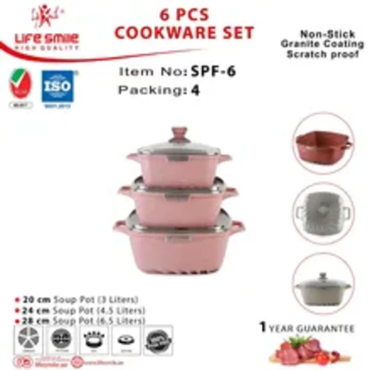 .سرویس قابلمه 6 پارچه لایف اسمایل مدل SPF-6 یکی از محصولات برند محبوب لایف اسمایل می باشد که برای هر آشپزخانه ای ضروری است. این سرویس 6 پارچه شامل 3 قابلمه در سایز های 20، 24، 28 سانتی متر است. جنس این سرویس کاربردی از آلومینیوم ریخته گری بوده و به همین دلیل مقاومت حرارتی بالایی داشته و تا دمای 200-240 سانتی گراد را تحمل می کند. درب های شیشه ای آن نشکن، مقاوم در برابر حرارت و دارای دریچه خروج بخار است که مانع سر رفتن غذاها می شود. دستگیره های این سرویس به صورت یکپارچه با قابلمه بوده و از جنس بدنه آن است و از استحکام بالایی برخوردار می باشد.