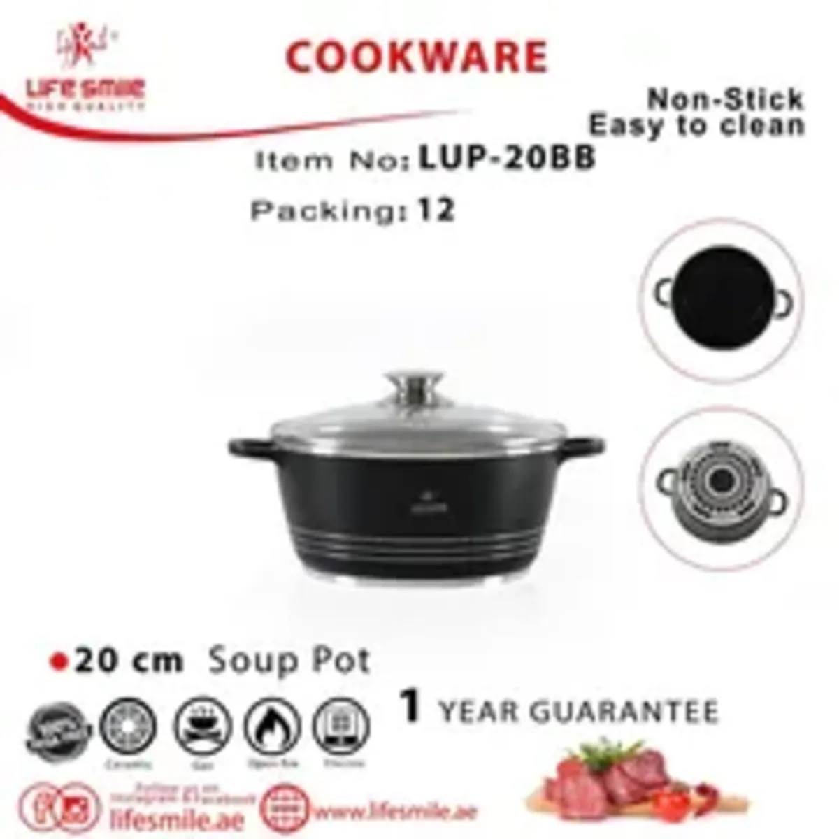 قابله سرامیکی LIFE SMILE در اندازههای متفاوت تولید.میشده است. جنس درب این قابلمه از جنس شیشه بوده که در برابر حرارت و گرما بسیار مقاوم است. بر روی درب یک دریچه خروج بخار به منظور جلوگیری از سر رفتن مواد غذایی تعبیه شده است. دستگیرهها به صورت یکپارچه با بدنه ساخته شدهاند و این امر ایمنی را بیشتر و جابجایی قابلمه را ساده تر میکند. قابلمه لایف اسمایل قابلیت استفاده بر روی انواع اجاق گاز از جمله هالوژنی، سرامیکی، برقی و گازی را دارد. علاوه بر این از آن میتوانید در داخل مایکروویو نیز بهره گرفت.