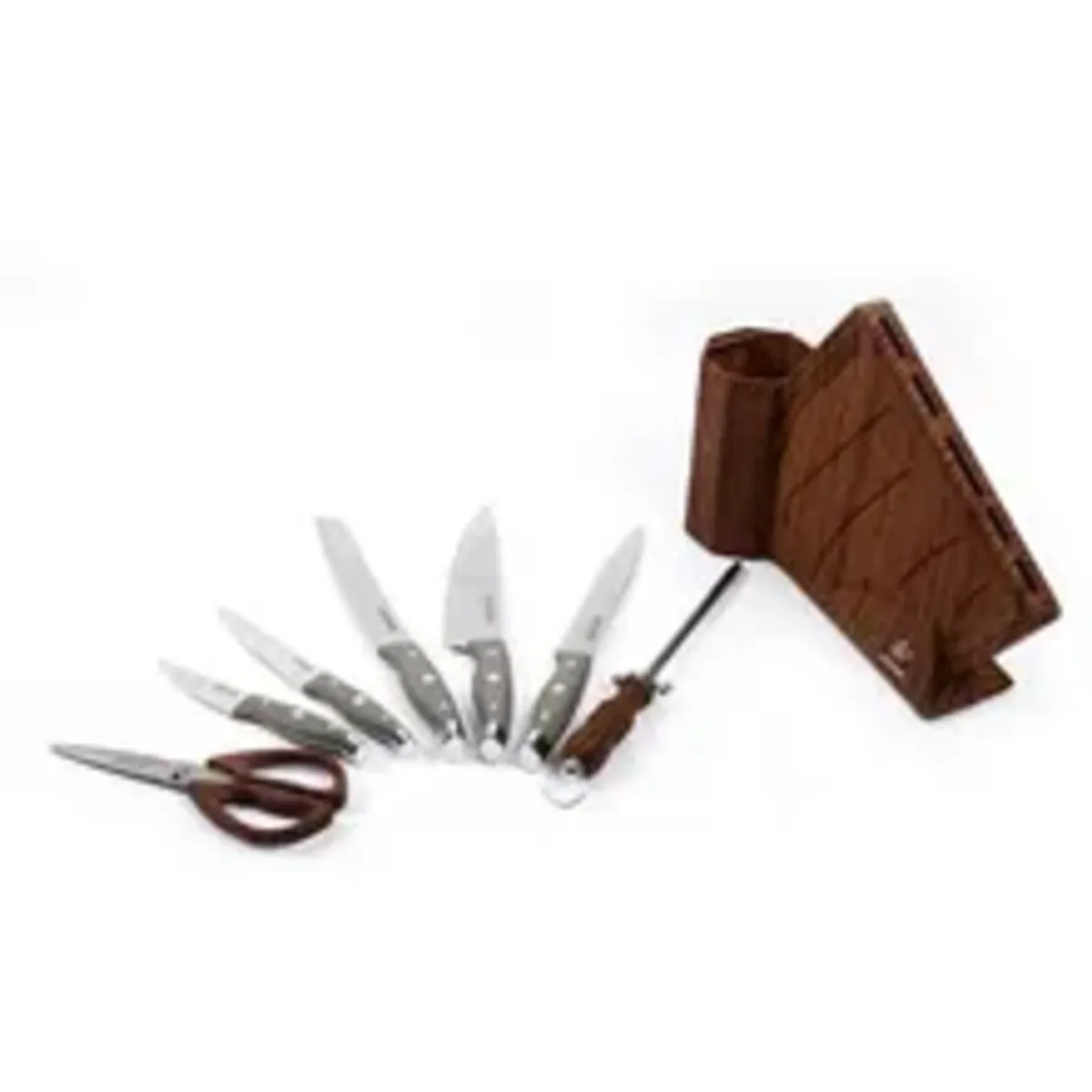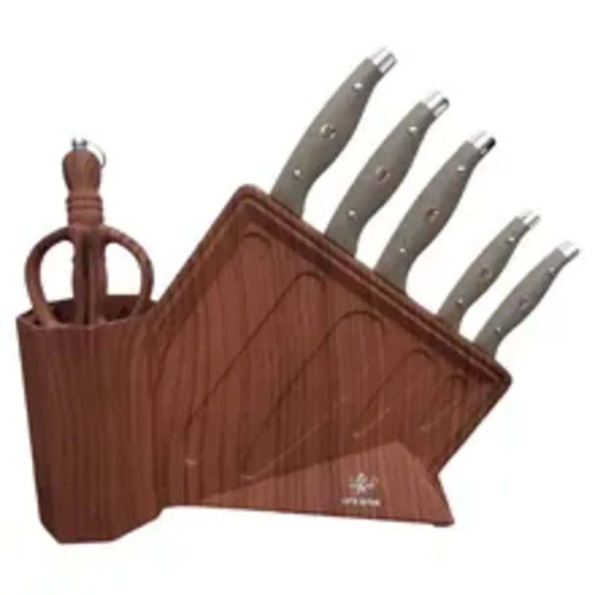 سرویس چاقو 8 پارچه لایف اسمایل مدل NSEL_1 یکی از پرطرفدارترین چاقوها میباشد که در عین سبک بودن بسیار خوش دست میباشد سرویس چاقو آشپزخانه دارای هفت سری و یک ظرف نگهدارنده میباشد این ست شامل پنج عدد چاقو *سوهان *قیچی ویک استند میباشد سری چاقو از استیل و دسته آن از پلی پروپیلن بوده که زیبای محصول را دو چندان میکند