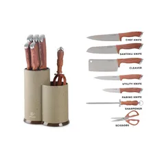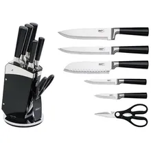 سرویس چاقو آشپزخانه لایف اسمایل مدل NSEL-5 یکی دیگر از محصولا با کیفیت و زیبای برند life Smile میباشد. ست چاقو لایف اسمایل از 8 پارچه مختلف شامل چاقو خردکن، چاقو سرآشپز، چاقو نان، ابزار چاقو، چاقو تکهای، شارپنر، قیچی و محفظه نگهداری چوبی تشکیل شده است.