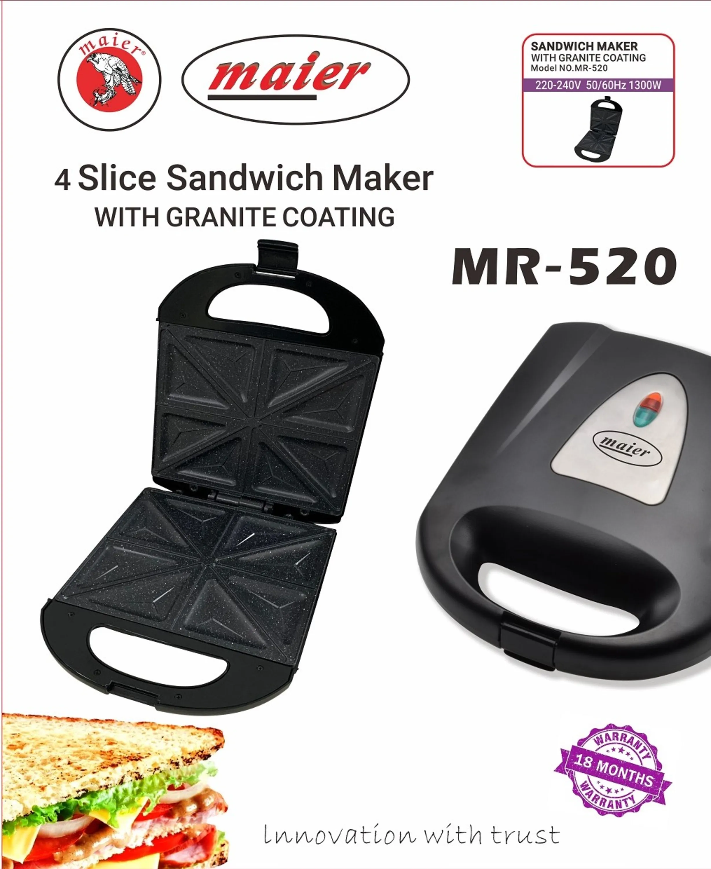 ساندویچ ساز مایر مدل MR-520 با توان مصرفی 1300 وات طراحی و تولید شده است که موجب آماده شدن انواع ساندویچها در یک چشم به هم زدن میگردد. هنگامی که دستگاه روشن میشود، تشعشع مادون قرمز از سیم پیچ های فلزی ایجاد میشود که نان را گرم میکند. این دستگاه دارای 2 عدد سینی اسلایس ساز است. جنس صفحهها از تفلون بوده و از چسبیدن و سوختن موادغذایی جلوگیری میکنند. به کمک این دستگاه میتوانید انواع ساندویچهای مرغ، ساندویچ با سبزیجات، ساندویچ پنیر و ساندویچ کبابی را در یک چشم به هم زدن آماده کنید.