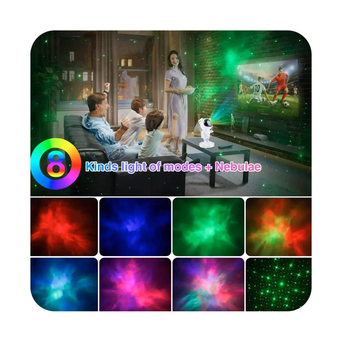 این محصول یک پروژکتور با قابلیت پخش نور در قالب ترکیب 8 رنگ فضایی متفاوت را در محیط اتاق خواب شما ایجاد می کند. این محصول می تواند یک هدیه مناسب برای نورپزدازی اتاق خواب کودکان باشد و یا برای ایجاد یک فضای رمانتیک و به یادماندنی در اتاق یا حتی اتاق گیم شما مورد استفاده قرار گیرد.