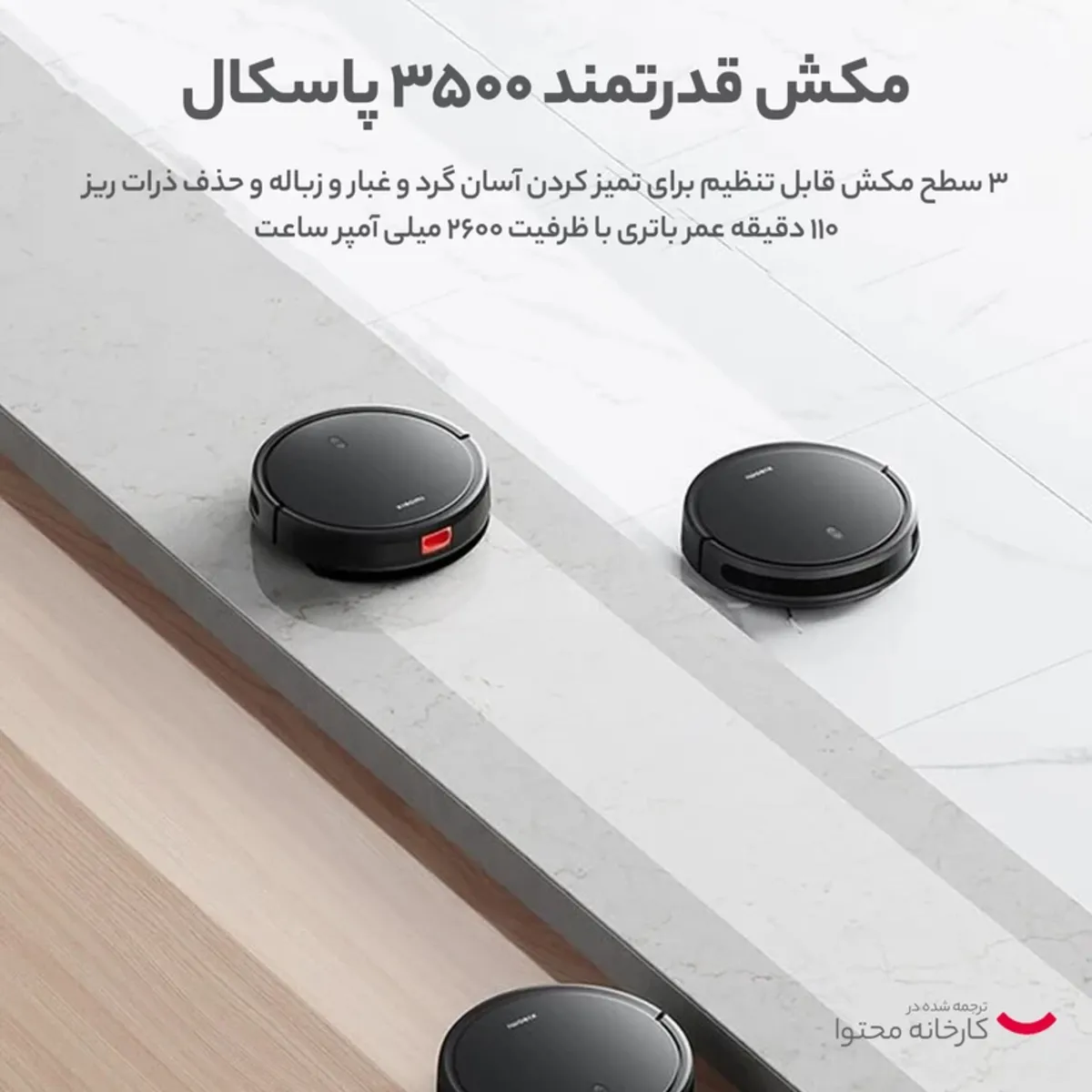 شیائومی ربات جاروبرقی E10C جدید خود را با قدرت مکش 3500Pa برای مخاطبان جهانی رونمایی کرد. این دستگاه خانه هوشمند سه درجه تنظیم جریان آب و چهار حالت برق را ارائه میدهد و باتری 2600 میلی آمپری آن میتواند با یک بار شارژ تا 110 دقیقه کار کند. ربات جاروبرقی E10C شیائومی دارای یک برس لاستیکی در زیر بدنه و یک برس کناری برای جمع آوری زباله است. دستگاه جدید خانه هوشمند شیائومی دارای سه درجه تنظیم تمیزکننده و مجهز به سنسور تشخیص موانع است. این ربات میتواند به طور هوشمند موثرترین مسیر را برای عملیات خود با یک مسیر تمیز کردن زیگزاگ برنامه ریزی کند. همچنین به طور هوشمند جریان آب را در صورت لزوم در حین عملیات تنظیم میکند. زمانی که باتری ربات تمام شود، دستگاه به طور هوشمند به جایگاه شارژ خود باز میگردد.ربات جاروبرقی E10C شیائومی را میتوان به اپلیکیشن Mi Home یا برنامه Xiaomi Home متصل کرد. از این طریق کاربر میتواند که تنظیمات ربات را تغییر دهد، یک برنامه تمیز کردن تنظیم کند یا پیشرفت کار جاروکشی و تمیز کردن ربات را نظارت کند. این دستگاه همچنین اعلانهای صوتی را ارائه داده و از الکسای آمازون یا دستیار گوگل پشتیبانی میکند. ربات جاروبرقی E10C شیائومی دارای طراحی باریک و دایرهای است که به آن اجازه میدهد تا به راحتی در داخلی اتاق حرکت کند. این دستگاه میتواند به خوبی زیر مبلمان حرکت کرده و با استفاده از حسگرهای تشخیص مانع، از موانع اجتناب کرده و در عین حال از پلهها سقوط نکند.