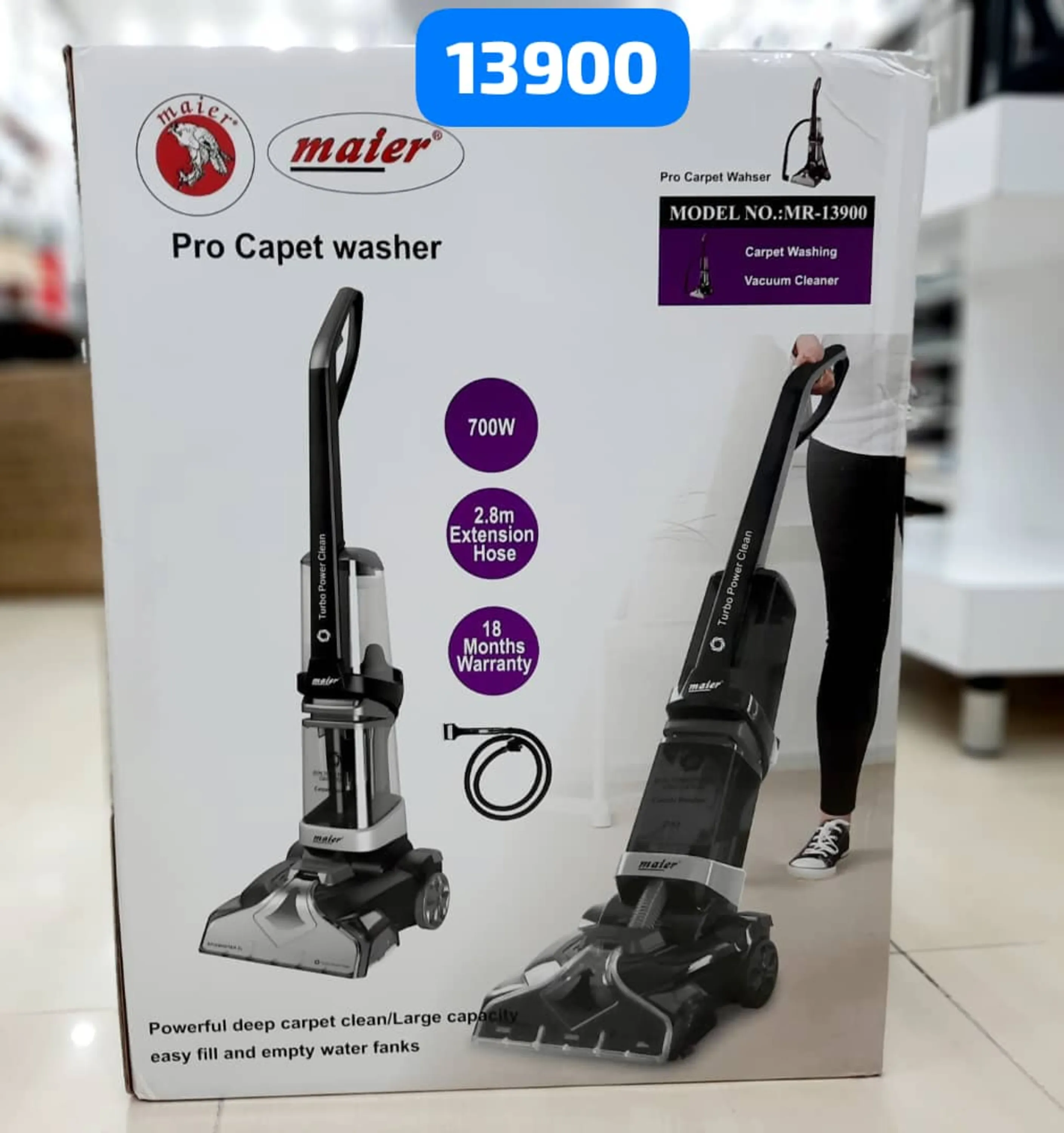 فرش شوی و مبل شوی مایر مدل MR-13900 دستگاهی پر کاربرد با طراحی ظاهری زیبا و مدرن است که سبب تمیز شدن خانهی شما در یک چشم به هم زدن میشود. بدنهای محکم و با استحکام بالا از جنس پلاستیک و فلز موجب میگردد این فرششو به صورت مادامالعمر برای شما کار کرده و فرشها را تمیز گرداند. یک مخزن با ظرفیت 1.6 لیتر برای قرار گرفتن شویندهها قرار گرفته ست و مخزن دوم با گنجایش 2.1 لیتر جهت مکش گرد و خاک و مایعات اضافی میباشد. همچنین به کمک چند سری مختلف میتوانید سطوح مختلفی مانند فرش، موکت، مبل و ... را به کمک این دستگاه بشویید. رنگ بدنه در این فرششوی از کمپانی مایر ترکیب جذابی از مشکی و نقرهای میباشد که بسیار خاص و منحصر به فرد بوده و میتوانید آن را با دیگر لوازم ست کنید. در بخش پشتی سری تمیز کننده، 2 عدد لاستیک مقاوم قرار داده شده است که منجر به حرکت آسان دستگاه بر روی سطوح مختلف میشود. فرش شوی و مبل شوی مایر مدل MR-13900 دارای 2 مخزن جداگانه است